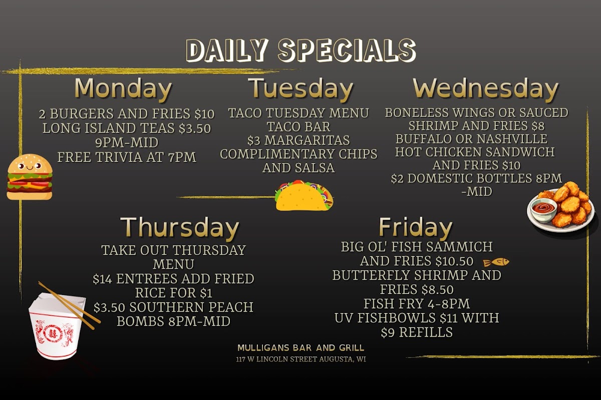 - Casual bites and daily specials adapt well to different times of the week, from taco nights to traditional fish fry Fridays.